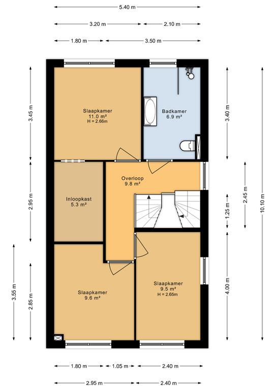 - 1e slaapkamer aan achterzijde (afm. 3,20m x 3,45m) en annex een inloopkast van ruim 5m2