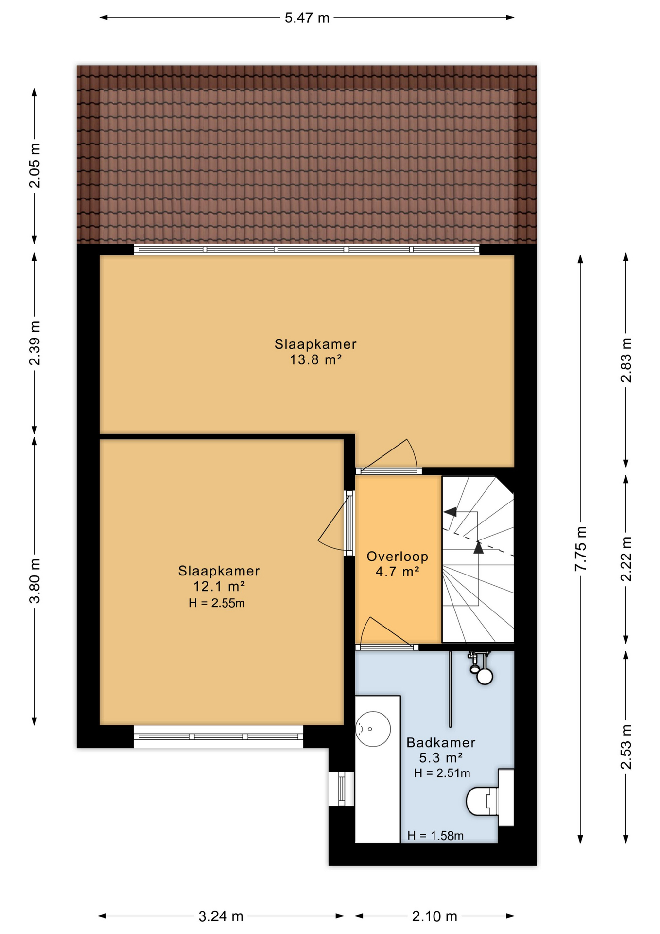 - tweede slaapkamer achterzijde van de woning (afm. 2,39m x 5,47m)