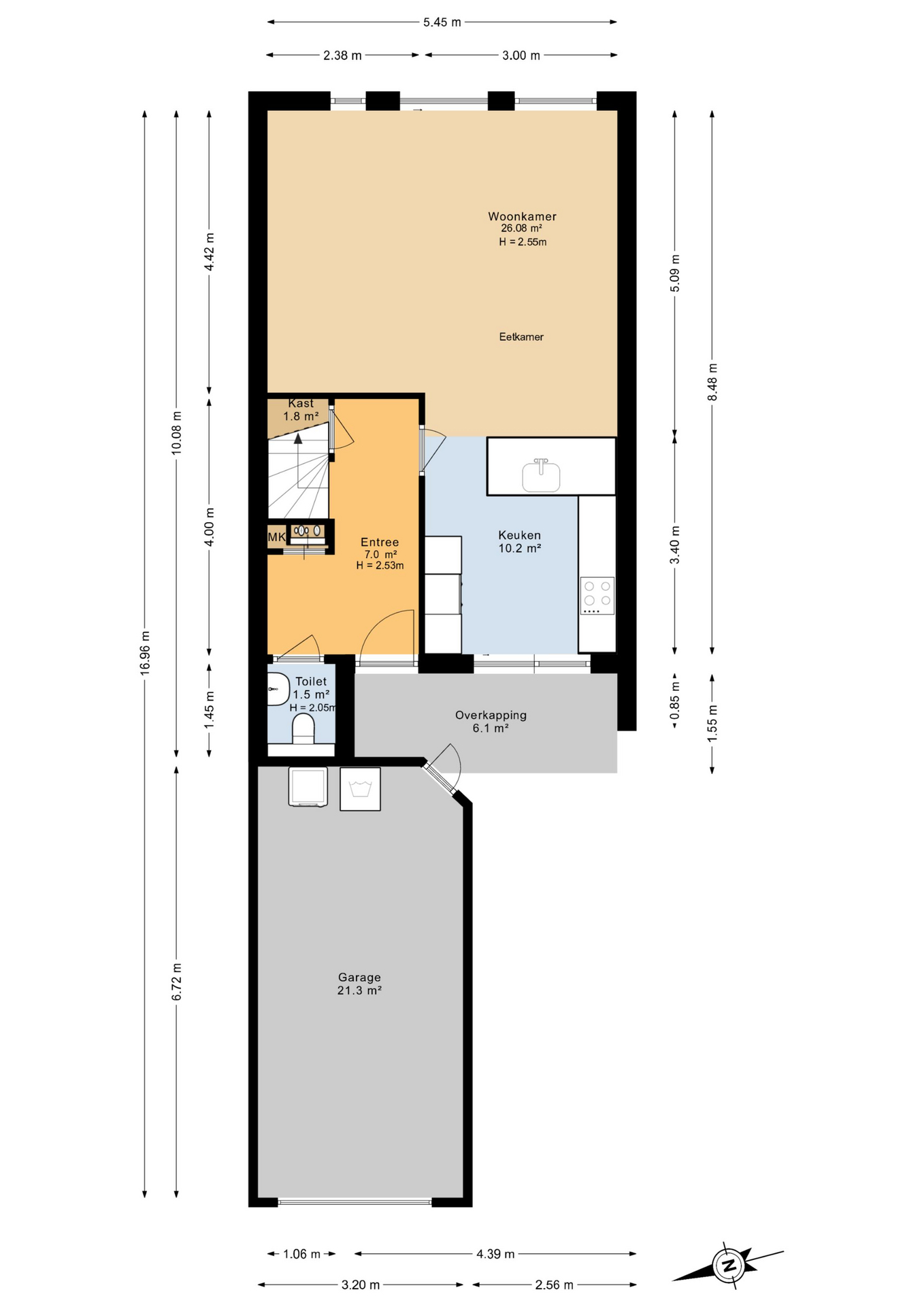 Via de voortuin bereikt u de entree van de woning. Binnen komt u in de hal met meterkast, toilet, trapopgang en toegang tot de woonkamer. De lichte woonkamer van circa 26 m² heeft een prettige indeling en staat in directe verbinding met de tuin via een schuifpui, wat zorgt voor veel lichtinval en een fijne overgang tussen binnen en buiten. Er is voldoende ruimte voor een comfortabele zithoek en een royale eettafel. De nette open keuken grenst aan de woonkamer en is praktisch ingericht met diverse inbouwapparatuur en ruime werk- en bergruimte. Dankzij de schuifpui is er veel lichtinval en directe toegang tot de voortuin.